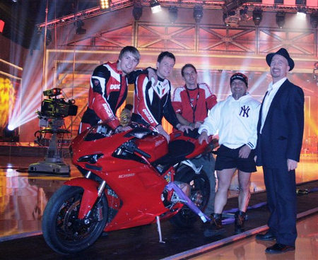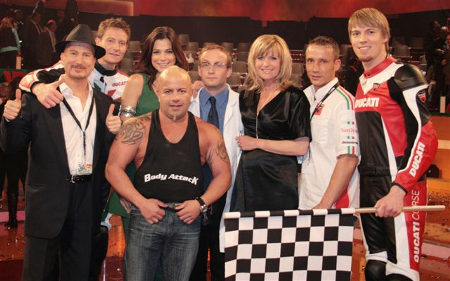 Sherry Foruton aus Hamburg, erfolgreicher Kraftsportler, Management by Joe Alexander ENTERTAINMENT / powered by Body Attack und Ducati wird sich zwischen zwei DUCATIs 1098s stellen, um bei Vollgas und qualmenden Reifen die Zugkraft von ca. 600 - 800 Kg länger als 15 Sekunden lang zu halten, ohne dass er auseinandergerissen wird! Ist es möglich, die stärksten 2-Zylinder Maschinen der Welt zu halten? Wigald Boning und Barbara Eligmann präsentieren in MEGA CLEVER - Die NKL-Show spektakuläre Großexperimente und prominente Gäste. Einfach einschalten und wissen! Mehr Infos: SAT1. MEGA CLEVER Wir wünschen Ihm viel Glück und lot´s of POWER!!! Mit powerischen Grüßen
